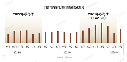 報告指出,受服飾客單價和下半年雙11、春節大促關注度等因素的影響,服飾商家們對于秋冬季銷售期愈趨重視。從銷售規模來看,相比春夏季,如今秋冬季已經成為更重要的節點。數據顯示,2023年秋冬季抖音電商平臺月度銷售額相較2022年上漲了42.8%,銷售額增長明顯。
