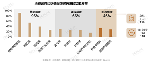 報告顯示,消費者對秋冬季服飾的功能性要求更加多元。保暖、耐臟等基礎功能已是消費者心中的“默認保有項”,硬核功能(諸如透氣性、防靜電等強技術性特點)和時尚功能在消費者購物關注度占比分別達到66%和46%。
