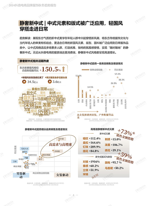 以“靜奢新中式”風格為例,主要是指受新中式風潮影響,從完全中式的設計到適合日常的改良新國風、中式元素、版型、面料被廣泛應用在日常服飾品類中。抖音電商2023年秋冬服飾數據顯示,包括立領、盤扣、對襟、刺繡等新中式關鍵詞在秋冬品類(諸如衛衣、羽絨服、毛衣)中增速明顯。