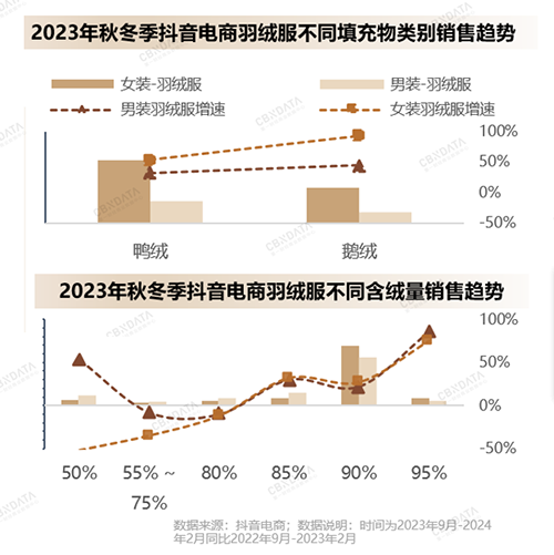 報告指出,針對羽絨服品類,男性消費者決策時更關注功能,而女性消費者更關注填充物、含絨量、品質等因素,對于品類細節關注度增加。這一變化從實際消費側也得以驗證,2023年抖音電商數據顯示,女裝羽絨服含絨量90%及以上的產品銷售趨勢向好,含絨量80%及以下的處于下滑狀態。另外,從填充物角度看,女裝鵝絨羽絨服增速接近100%,表現亮眼。