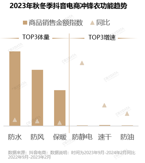 盡管從專業戶外運動單品已逐漸變為日常穿搭單品,但消費者對沖鋒衣的功能性需求仍抱以期待。抖音電商數據顯示,防水、防風、保暖三大功能占據2023年秋冬季沖鋒衣市場的最大份額,防靜電、速干和防油則屬于潛力趨勢功能。