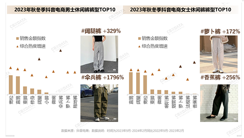 從抖音電商秋冬季褲子細分品類銷售情況來看,2023年秋冬季休閑褲品類銷售量最大,衛褲銷售額增速最快。種類多樣化的休閑褲品類已跑出亮眼的細分品類。數據顯示,男士休閑褲中闊腿褲、傘兵褲關鍵詞增速均破300%,女士休閑褲中,蘿卜褲、香蕉褲關鍵詞增速分別為172%和256%,增長迅速。