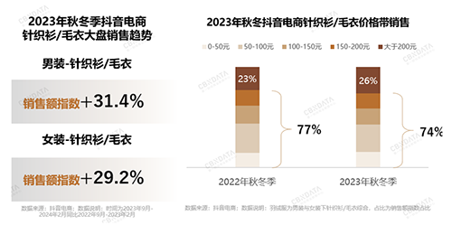 從價格帶來看,相較2022年秋冬季,200元以下的價格仍占據2023年抖音電商秋冬季服飾的銷售主流,200元以上的針織衫/毛衣銷售份額則明顯提升。這說明相對價高質優的針織衫/毛衣產品被大眾接受,該品類已邁向品質化發展道路。