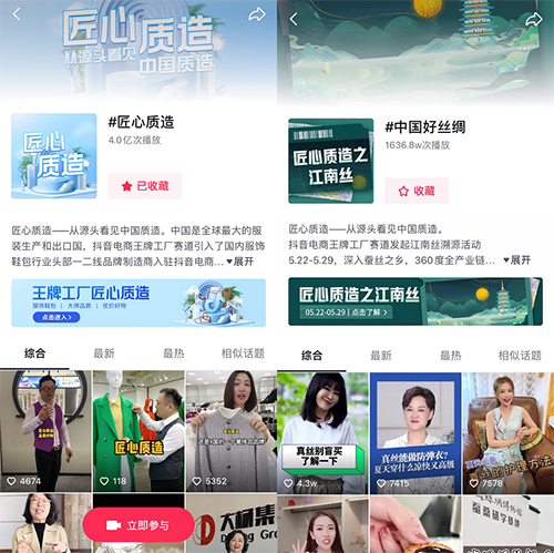 為了加深消費者對絲綢的了解,同時給其更直觀的感受,在此次活動期間有數(shù)百名真絲品類的商家發(fā)布溯源內(nèi)容的短視頻,活動期間商家投稿數(shù)量過千條,王牌工廠長期話題#匠心質(zhì)造話題播放量達(dá)高4億,活動話題#中國好絲綢話題播放量達(dá)1600W+,點贊數(shù)破萬短視頻15個;商家通過拍攝車間、流水線、設(shè)計理念、呈現(xiàn)中國好絲綢匠心工藝。