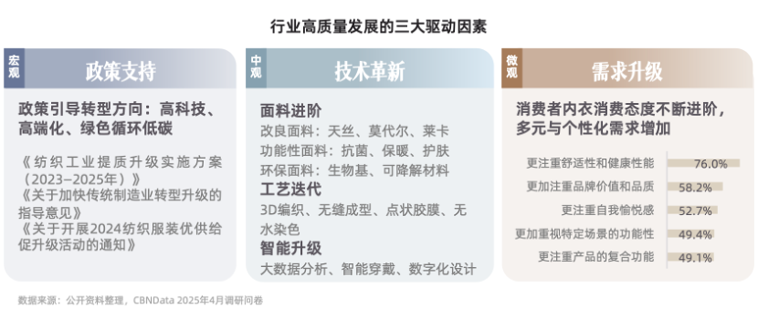內衣市場的高質量發展整體受到宏觀政策支持、中觀技術革新和微觀需求升級三大因素影響:政策支持主要為行業轉型提供了明確方向和重要支撐;面料和工藝的持續優化助力產業加速升級;消費者內衣需求的進階則促使企業提升產品水準。