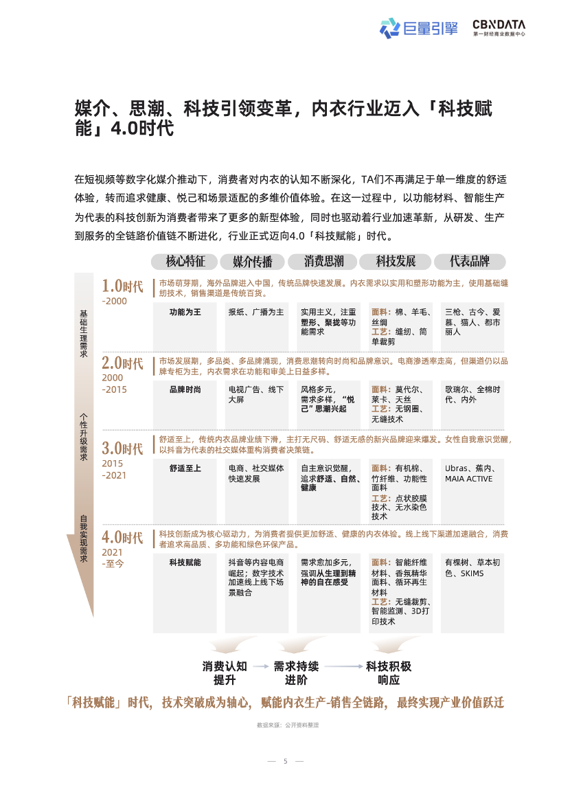 ![]() 從歷史發展脈絡來看,整個內衣市場已經歷經了從強調功能為王的1.0時代(2000年之前)、追求品牌時尚的2.0時代(2001-2015年)和推崇舒適至上的3.0時代(2016-2021年),如今伴隨著內容電商等新興媒介滲透率不斷提升、個性悅己思潮涌動和以功能材料為代表的底層科技革新,內衣行業已然邁入了科技賦能的4.0時代(2021年至今)。