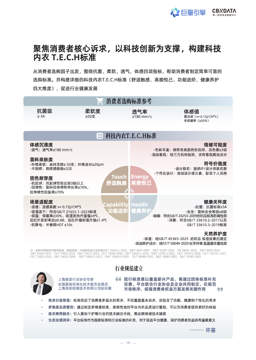 這一背景下,巨量引擎與第一財經商業數據中心(CBNData)聯合發布《2025科技內衣趨勢洞察白皮書》(下稱《白皮書》),旨在通過梳理當前內衣市場階段特征、內衣消費人群洞察和內衣品類趨勢,幫助內衣行業品牌商家識別當前階段紅利,并提供更為精準、敏捷、有效的營銷策略參考。與此同時,《白皮書》也基于上海服裝行業協會專家意見,推出面向“科技內衣”賽道的T.E.C.H標準,以促進行業健康發展。