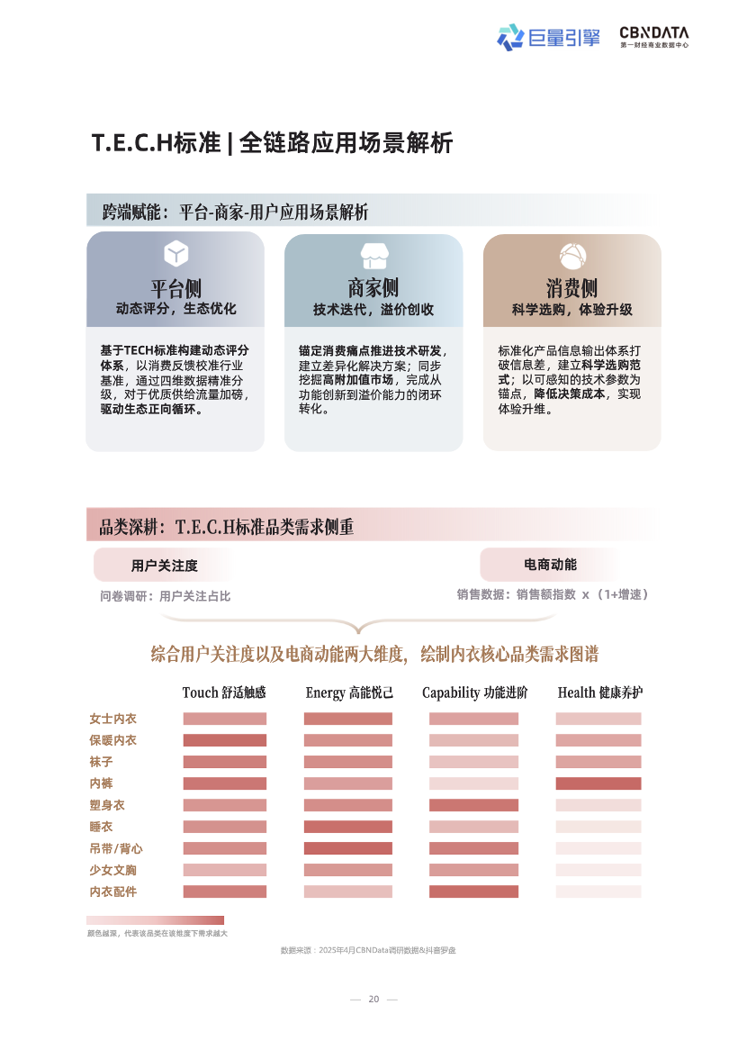 ![]() 對于整體內衣市場而言,T.E.C.H標準作用于行業生態全鏈路,旨在從平臺、商家和消費者層面對行業發展給予助力。細分到具體品類來看,不同內衣細分類目在四大維度上的用戶關注度和電商動能各有不同,這也決定了后續品牌商家產品研發的方向側重。《白皮書》也通過女士內衣、保暖內衣、襪子、內褲和塑身衣這五大類目進行趨勢全解。