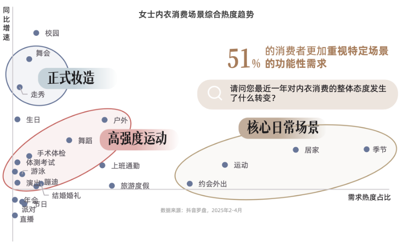女性內衣消費數據顯示,除核心日常生活場景外,正式妝造、高強度運動等新興場景需求增長明顯,這也驅動品牌圍繞這些新興場景要加快構建場景化營銷體系。
