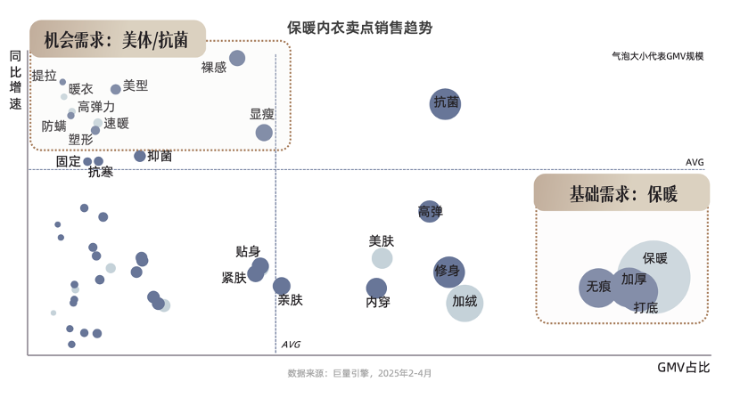 保暖是品類核心需求,與此同時消費者也對內衣提出美體、抗菌等進階需求。從面料需求來看,抖音電商數據顯示,桑蠶絲、山羊絨、駱駝絨等高端材質愈加受追捧,而遠紅外發熱、空氣鎖溫等“黑科技”加成促使保暖內衣在同樣厚度下更溫暖,同樣成為消費新趨勢。