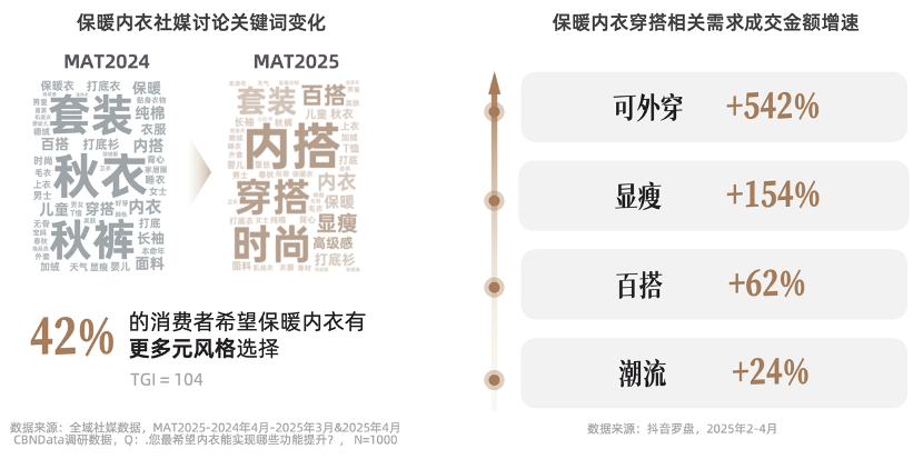 ![]() 保暖內衣相關討論中,內搭、穿搭、時尚、百搭等時尚需求相關關鍵詞討論度高增,近半數消費者期望風格多元化以滿足內衣外穿需求。