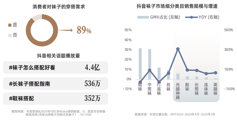 ![]() 另一方面,近九成消費者表示會根據服裝風格搭配不同襪子,相關話題在抖音平臺引發廣泛討論。抖音平臺上,光腿神器、中筒襪、長筒襪等裝飾性品類呈現高增態勢。