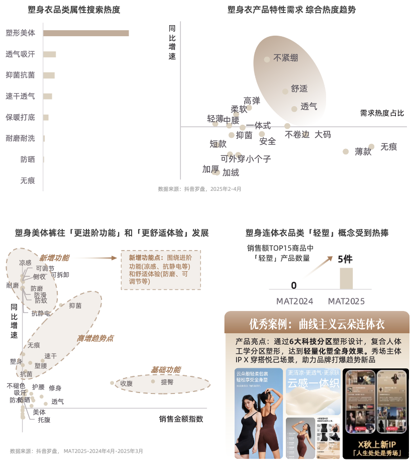 對于塑身衣品類而言,除塑形功能外,不緊繃、透氣舒適需求增長顯著。抖音平臺細分品類中塑身褲呈現出顯著的功能進階趨勢,在提臀、收腹基礎上新增涼感、抗靜電等功能,同時以速干、防磨、可調節等設計提升穿著體驗。塑身連體衣則從強塑形往輕塑形發展,舒適體驗也受到消費者熱捧。
