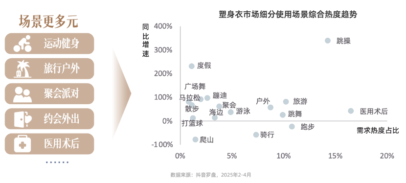 ![]() 值得一提的是,Z世代成為塑身衣消費的潛力客群。年輕群體傾向上身局部模塊化塑形單品,熟齡用戶偏好系統化整體塑形解決方案。另一方面,塑身衣穿戴場景向聚會派對、約會外出等多元化場景衍生,需通過差異化產品矩陣以及場景營銷,實現精準營銷。